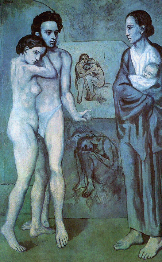 La gama cromática es fría y acerada y los fondos desnudos, hecho que resalta la faceta dramática de las composiciones, protagonizadas por personajes lánguidos y esbeltos con cierta influencia de la figuración grequiana. De este modo, el universo pictórico de Picasso se puebla, durante estos años, de personajes desolados, perdidos, como los que protagonizan los cuadros El viejo guitarrista (1903-1904) y La Vida (1903).